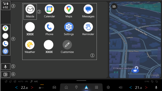 Displays notifications from the Android phone. 4 - Displays recently used applications. 5